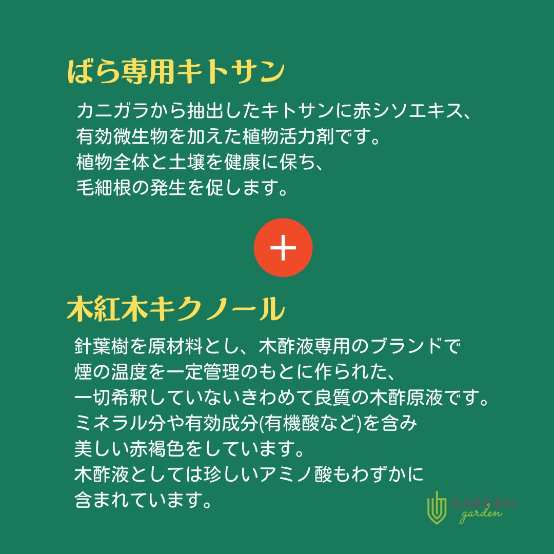 キトサンプラスには、木酢液キクノールとカニガラから抽出したキトサンが配合されています。この二つの成分を一緒に使用することで、以下のような効果が得られます: