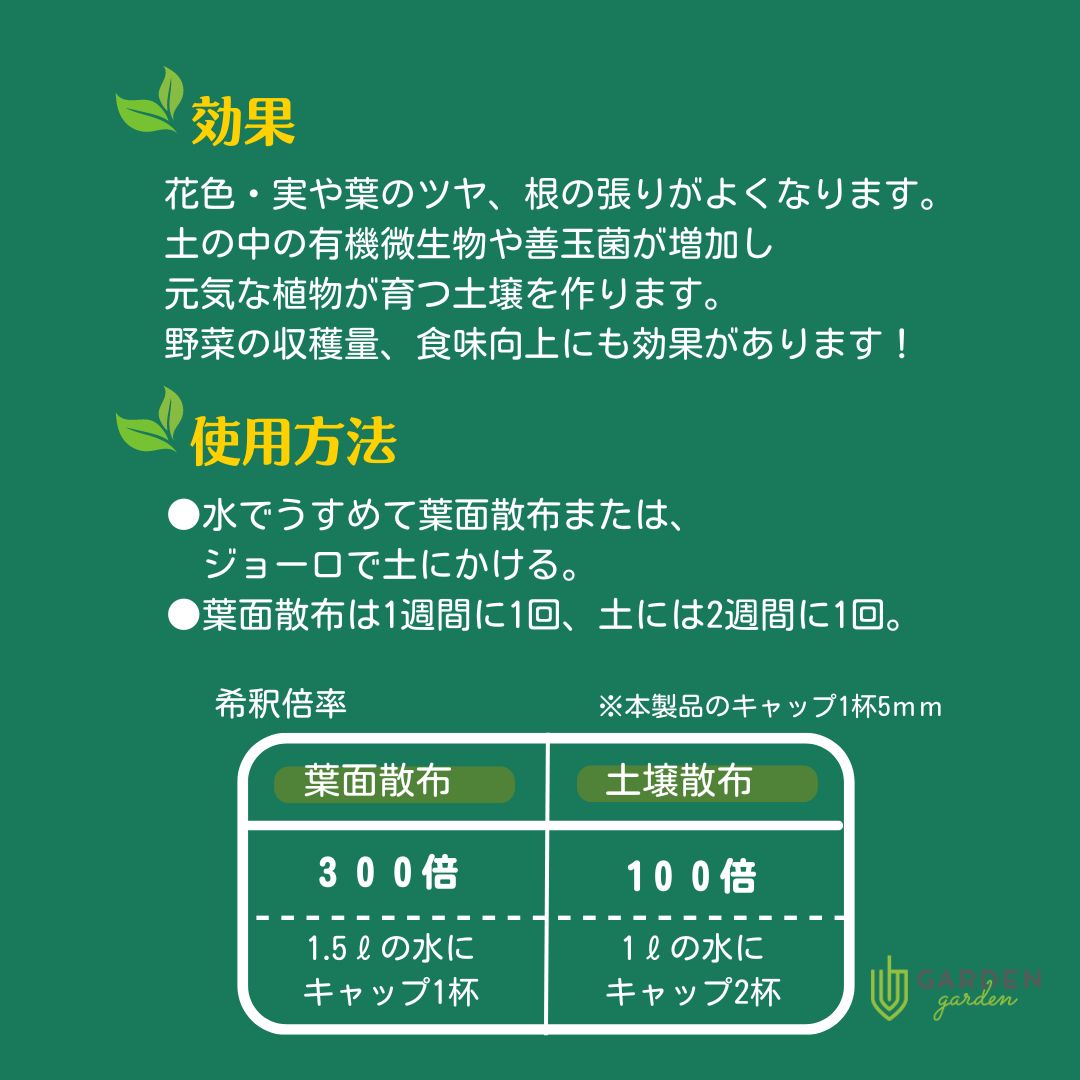 - 免疫活性化:有効微生物が土壌の健康を保ち、植物の免疫を高めます。
