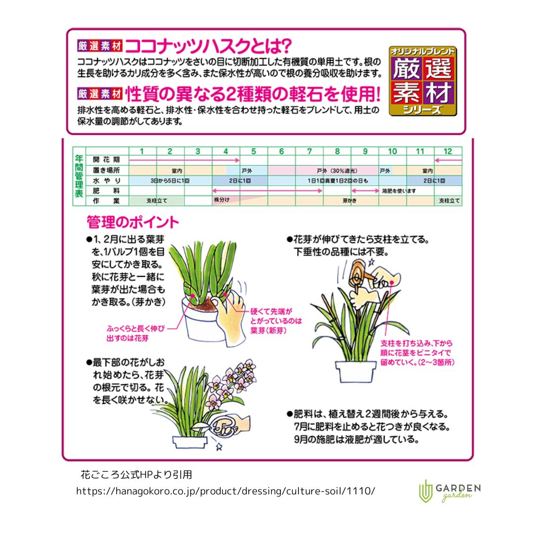 「洋蘭の培養土」は、これらの特性を考慮し、ココナッツハスクや軽石を配合することで、洋ランの健やかな成長をサポートします。