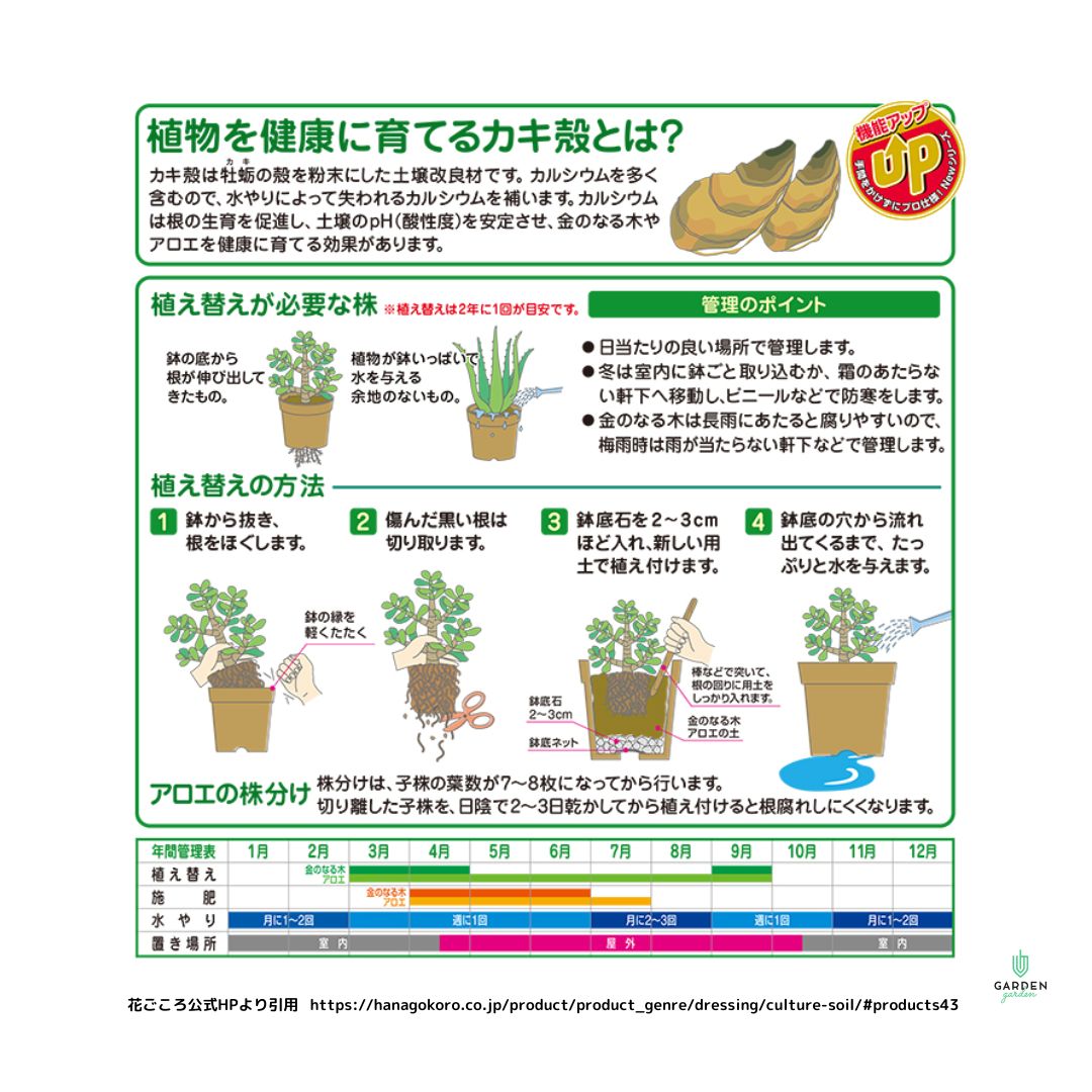 「金のなる木アロエの土 5L・12L」は、カキ殻由来のカルシウムで根の成長をサポートし、排水性の高い配合で根腐れを防ぐ専用培養土です。さらに、リン酸成分が豊富で、植物の成長を促進します。
