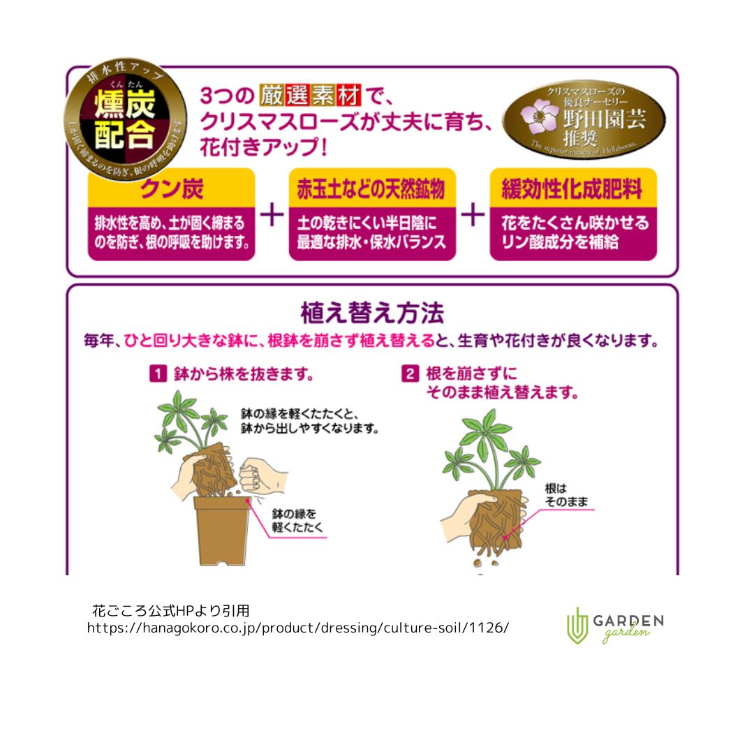 「クリスマスローズの土【花ごころ】」は、クン炭や赤玉土を含み、排水性と保水性のバランスが取れたおすすめの用土です。