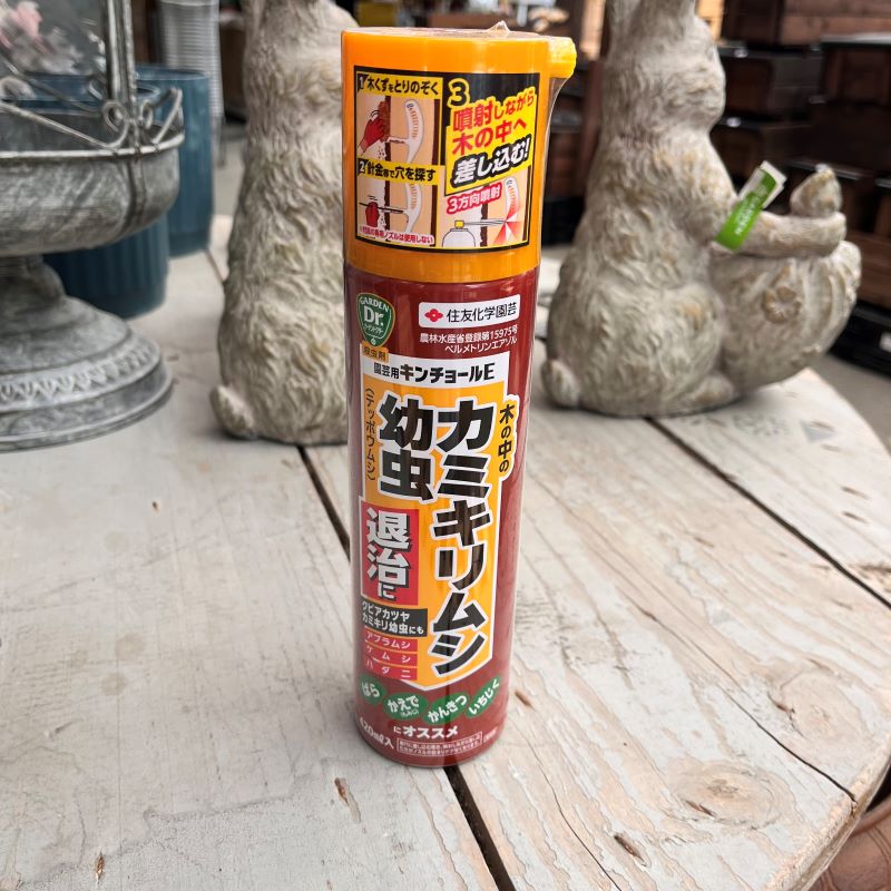 「園芸用キンチョールE」は、カミキリムシの幼虫や成虫にも効果的です。幹に発生する害虫を見つけたら、しっかりスプレーして退治しましょう。
